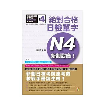 配合新制日檢,史上最強的日檢N4單字集《新制對應 絕對合格!日檢單字N4》,根據日本國際交流基金(JAPAN FOUNDATION)舊制考試基準及新發表的「新日本語能力試驗相關概要」,加以編寫彙整而成的。書中不僅搭配東京腔的精緻朗讀光碟,還附上三回跟新制考試形式完全一樣的單字全真模擬考題。讓您短時間內就能掌握考試方向及重點,節省下數十倍自行摸索的時間。可說是您應考的秘密武器!